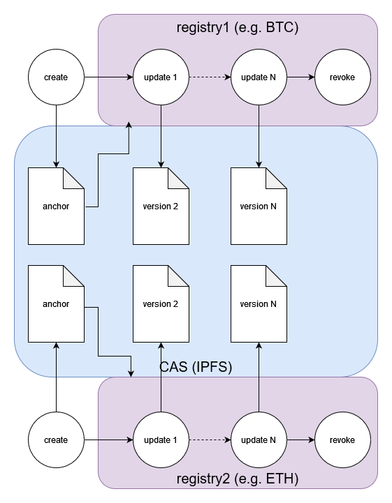 The key concept of this design is that DID creation is decentralized through IPFS, and DID updates are decentralized through the registry specified in the DID creation. The DID is decentralized for its whole lifecycle, which is a hard requirement of DIDs.